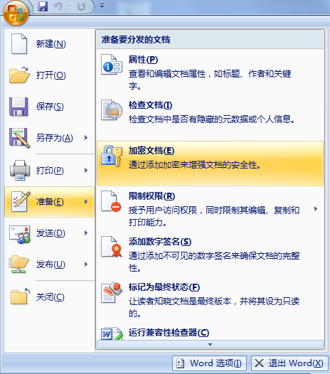 1.点office左上方的logo 2.在菜单点“准备” 3.点“加密文档”