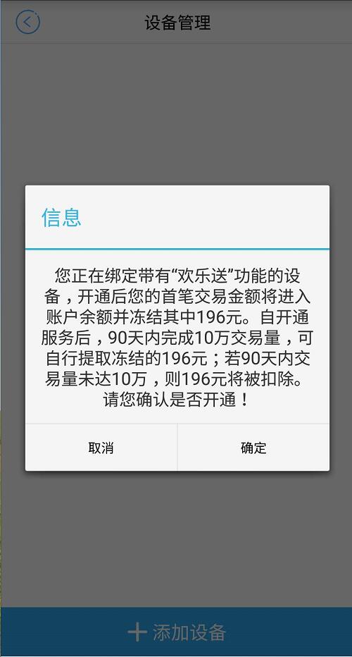 1.强制开通欢乐送功能,即:首次刷卡冻结196元,3个月刷满10万才可以解冻,不开通欢乐送功能根本不让你使用机器! 2.刷卡手续费是0.65+2,提现费是0.25!!次日免费(次日免费有什么意义?)0.62+0.25=0.9的手续费 ...