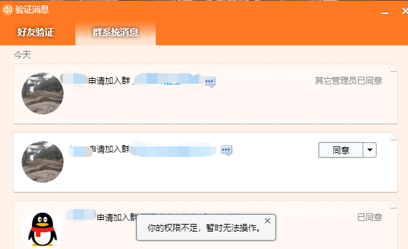 你的权限不足,暂时无法操作。 投诉无门,反馈无门! 我是群主,别人加群我同意不了,好几天遇到好几次了,真是服了。