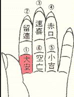二、简单算法: 小六壬预测方法十分简单,预测时只须提取当时的月、日、时信息,用左拇指在六个掌诀位上按顺时针方向依次掐算即知结果。其法以大安起正月,月上起日,日上起时。注意:这句话意思就是从月上开始计算日子,从日上开始计算时辰。如:占三月初五辰时吉凶。大安起数,三(月)是速喜,速喜起日(开始计算日子),五是大安。大安起时(开始计算时辰),辰时是小吉。 |
